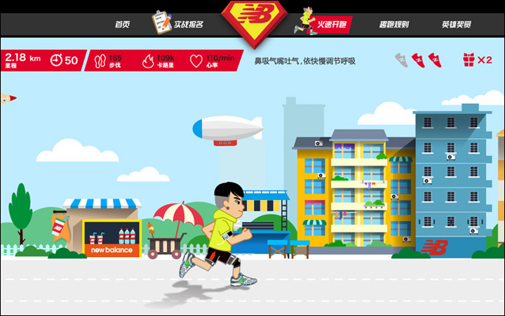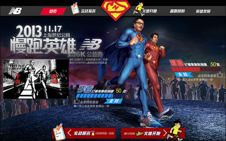 作為其互動營銷代理商的Leadinfo(立特整合營銷傳播機構)便以英雄扮演的趣味方式為New Balance創(chuàng)意了一款在線趣跑游戲http://newbalance.renren.com,用戶只需用人人網(wǎng)賬號登錄,即可選擇卡通角色邊跑邊體驗身為英雄的快感。