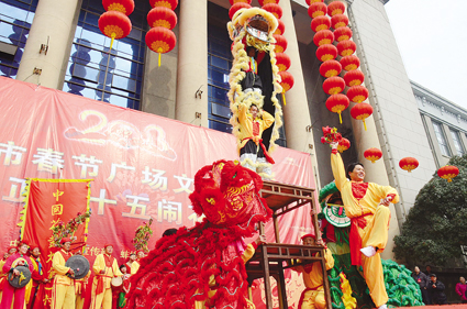 作為2013年蚌埠市春節(jié)廣場文化活動(dòng)的壓軸大戲,整場演出共有來自禹會(huì)區(qū)文化館、蚌山區(qū)文化館和龍子湖區(qū)文化館的8支花鼓燈表演隊(duì)先后登臺(tái)獻(xiàn)藝,一個(gè)小時(shí)的演出吸引了上千名市民駐足觀看。據(jù)市文廣新局負(fù)責(zé)人介紹,這8支花鼓燈隊(duì)伍從全市一百多支花鼓燈藝術(shù)團(tuán)中脫穎而出,聚集在科學(xué)宮廣場上表演,為市民送上元宵節(jié)藝術(shù)大餐。